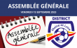 L'Assemblée Générale du District se tiendra ce VENDREDI 15 SEPTEMBRE 2023 à Beaupréau (Salle de la Loge) à 19h30. Pointage des clubs à partir de 18h30. Au plaisir de vous y retrouver !
