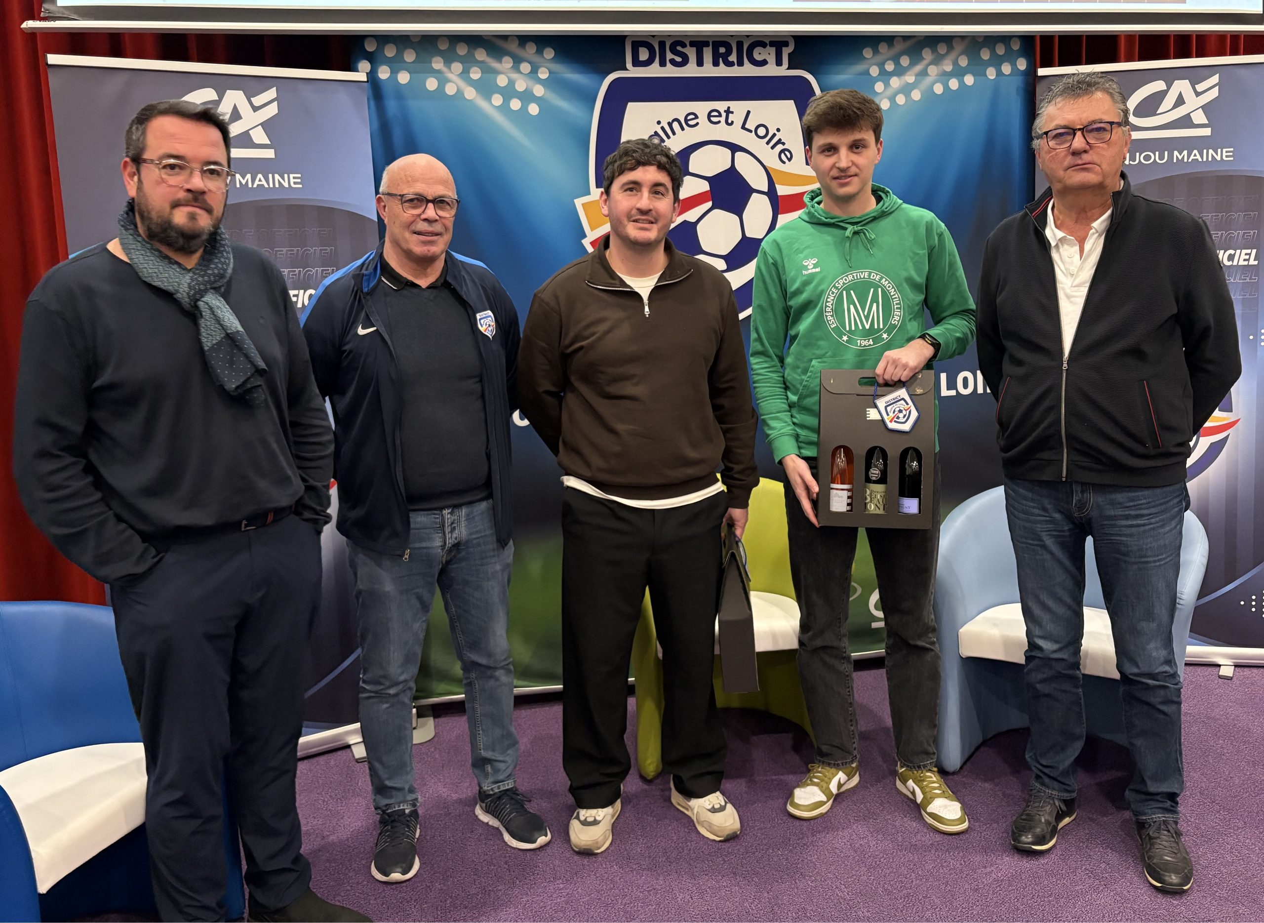 Avant le lancement des tirages, le District a souhaité mettre à l’honneur deux personnes. Théo CHARBONNIER, capitaine du club de Montilliers, était présent pour témoigner du parcours remarquable de son club, passé de la D1 lors de la saison 2019-2020 à la R1 pour la saison 2025-2026 ainsi que pour sa victoire en Coupe de l’Anjou lors de la saison 2023-2024.
