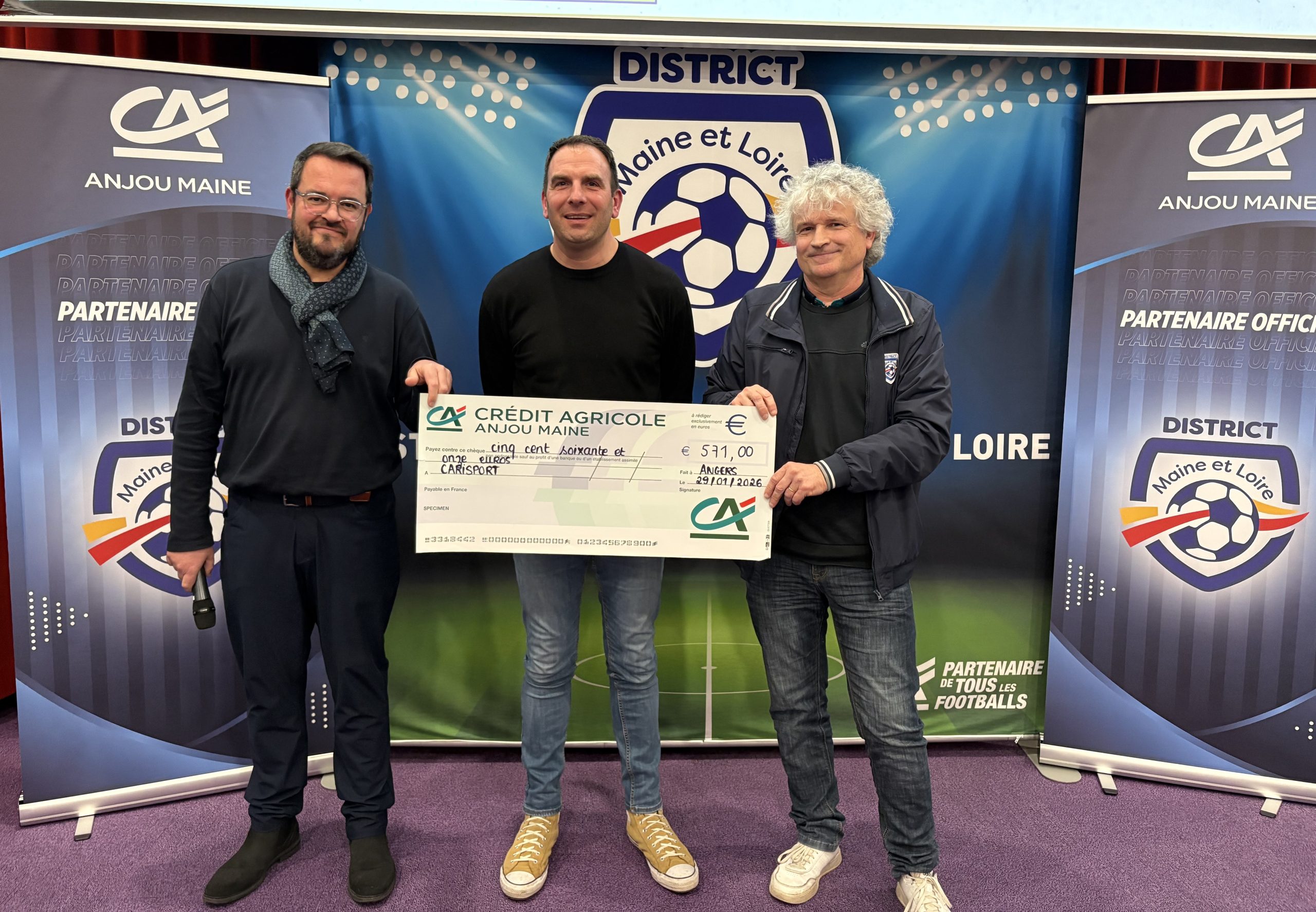 La soirée a également été marquée par un moment de solidarité avec la remise du chèque dans le cadre de l’opération « 1 but = 1€ », mise en place par le District en partenariat avec Carisport. Grâce aux buts inscrits lors des rencontres concernées, un montant de 571 € a été récolté et remis à Alexandre MARY, président de l’association.