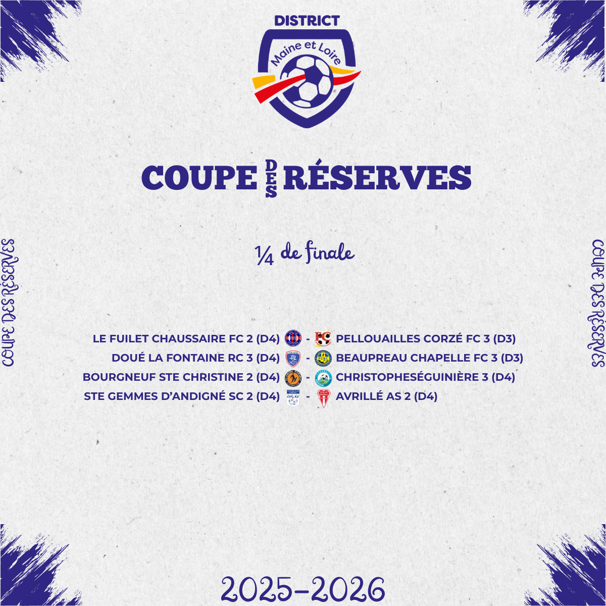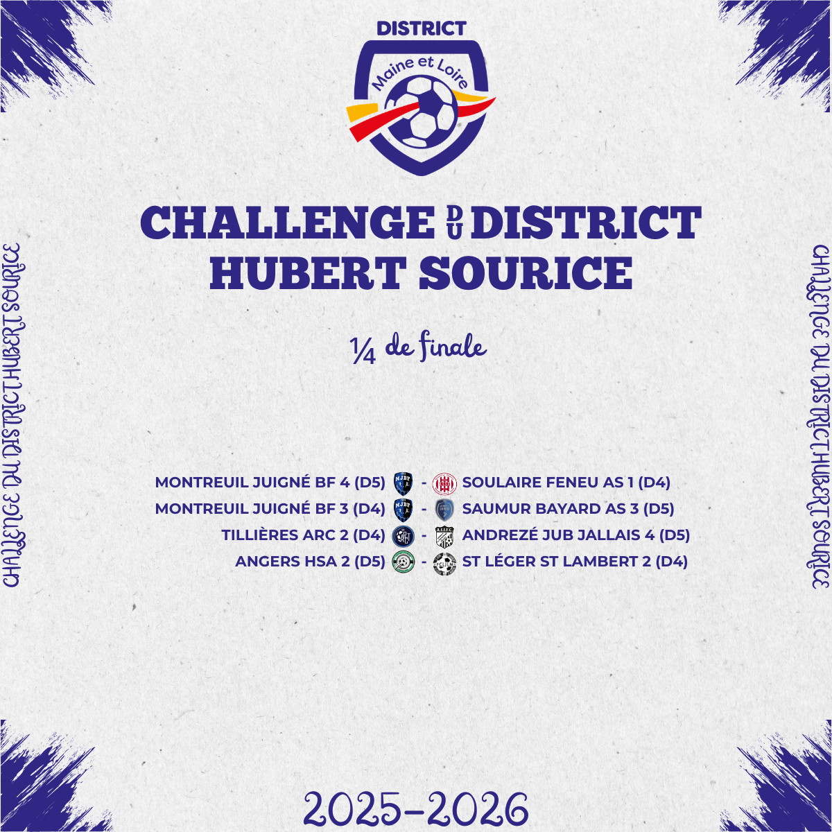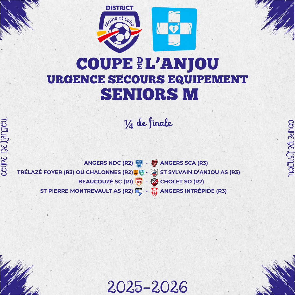 - 16èmes de finale de la Coupe de l’Anjou Urgence Secours Equipement Seniors M (Matchs le dimanche 11 janvier)